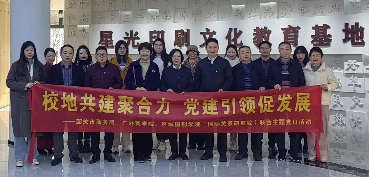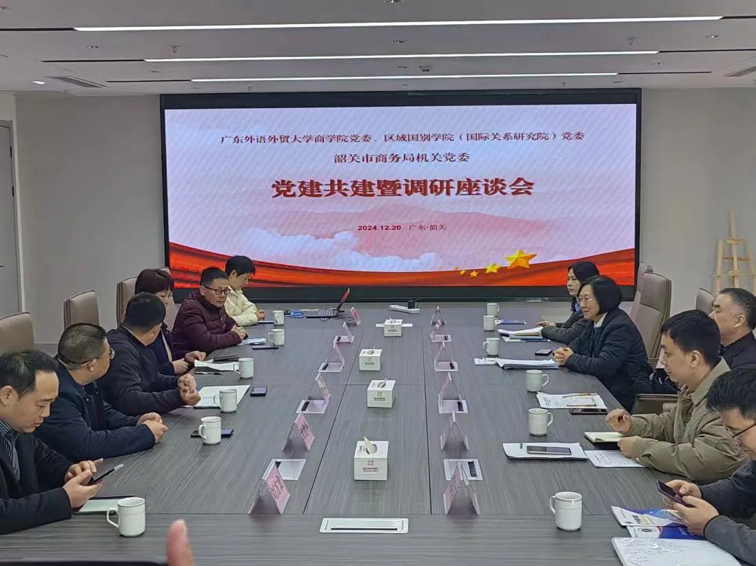 12月20日上午,两个学院党委与韶关市商务局举行了“校地共建聚合力 党建引领促发展”党建共建暨调研座谈活动。韶关市商务局党组书记、机关党委书记、局长张雯,党组成员、副局长丁冰,党组成员、副局长王卫军,机关党委专职副书记刘洁鹏,对外贸易科科长廖薇薇、广外韶关校友会会长刘亦翔等出席调研和交流活动。