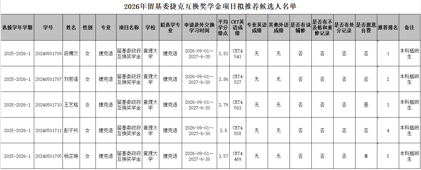 根据《关于做好国家留基委2026年捷克互换奖学金项目报名及选拔工作的通知》有关要求,经过学生自愿报名、专业选拔和学院审核,区域国别学院拟推荐5名本科插班生申请2026年留基委捷克互换奖学金项目,现予以公示。具体名单如下: