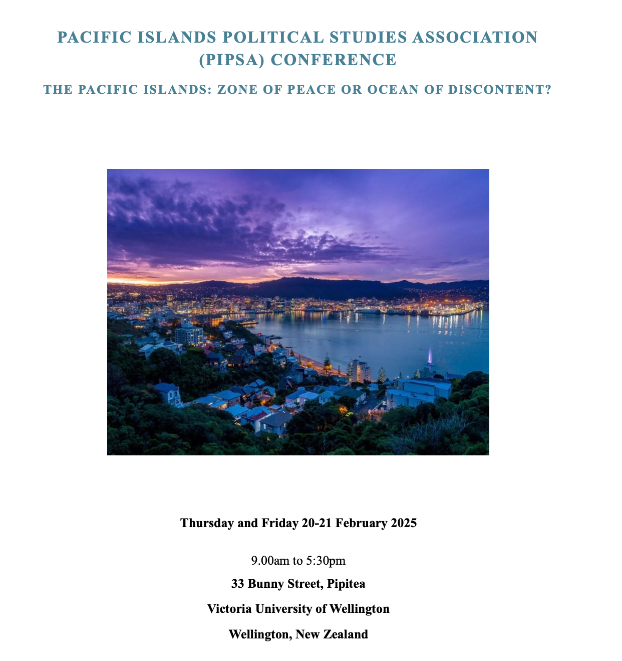 本网讯 2025年2月19日至21日,我院副院长、太平洋岛国战略研究中心副主任吴艳副教授受邀前往新西兰惠灵顿,参加太平洋岛国政治研究学会国际会议(Pacific Islands Political Studies Association Conference)并做主题发言。