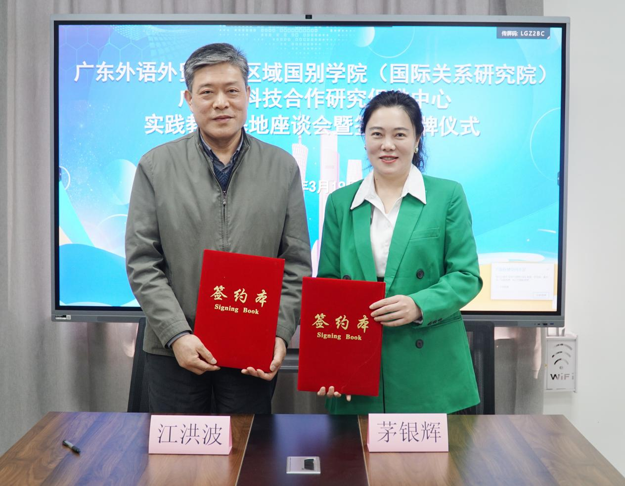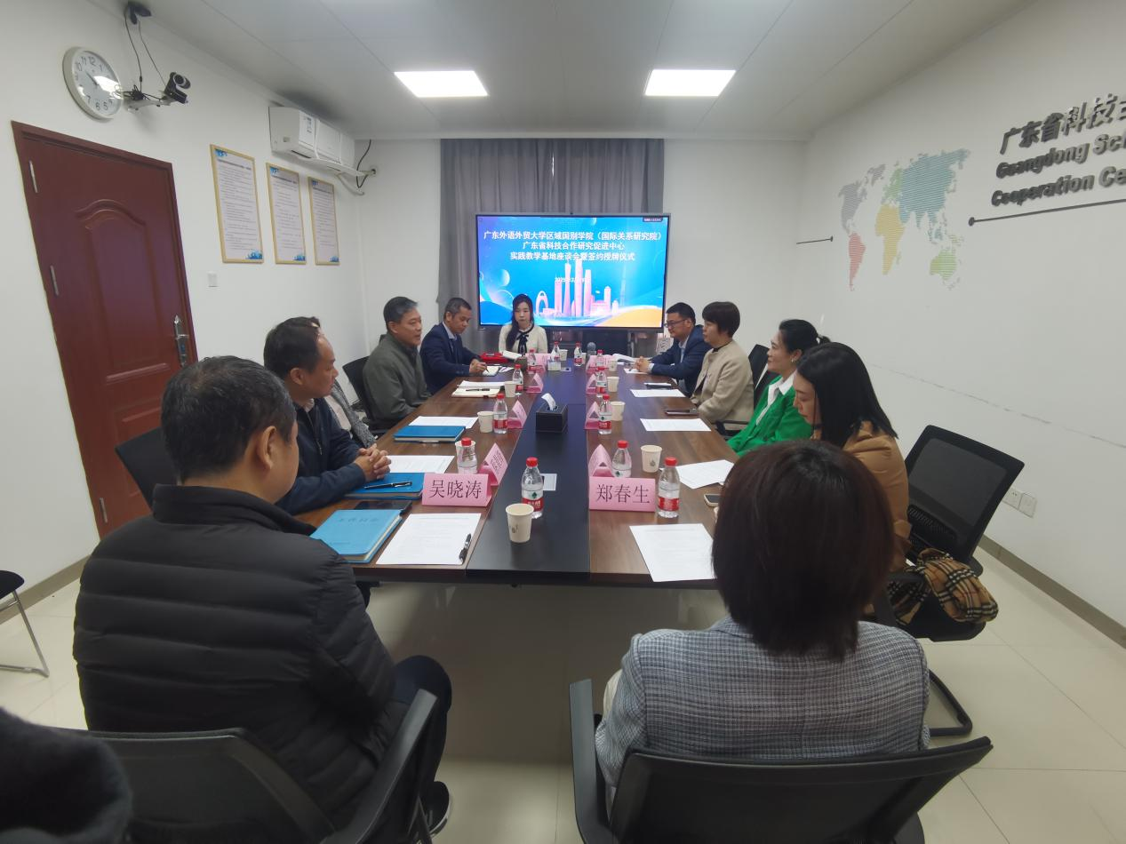 本网讯 3月19日上午,我院与广东省科技合作研究促进中心(以下简称“中心”)举行实践教学基地签约授牌仪式并座谈交流。我院党委书记袁薇佳,院长、党委副书记茅银辉教授,党委副书记陈健,院长助理、塞尔维亚语(克罗地亚语)系主任徐恒祎,第二教工党支部书记、区域国别研究院副教授郑春生,党政办公室主任谭珺如;中心主任、党支部书记江洪波,中心副主任李文德,中心党支部副书记熊燕,综合管理部(办公室)部长张郁,广东科展国际展览有限公司执行董事蔡景峰,广州顶美展览工程有限公司总经理吴晓涛等参与签约和座谈。