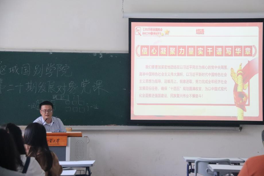 袁薇佳、陈健强调,两会不仅是国家政治生活中的大事,更是青年学子理解国家战略、规划人生方向的重要窗口,同学们要系统研读政府工作报告,关注记者会中的政策解读,尤其要思考“国家回顾过去一年工作、部署新任务背后的战略考量”。他们指出,当前国际形势复杂多变,外部压力与内部挑战并存,但我国经济“总体平稳、稳中有进”的态势,彰显了国家应对风险挑战的底气与智慧。此外,他们鼓励同学们把握广东作为外贸“排头兵”的区位优势,作为外语专业学生更应坚定信心:“只要对外开放的方向不变,外语人才始终不可或缺。”同时,建议同学们关注数字经济、AI技术等前沿领域,学习统计学知识,探索Deepseek等工具的应用,主动拥抱技术变革,将外语能力转化为跨文化沟通、国际传播的核心优势。