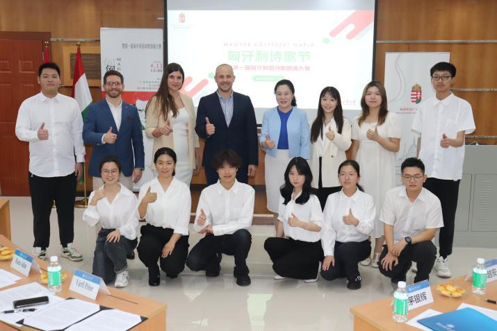 本网讯 411日,匈牙利诗歌暨第一届匈牙利语诗歌朗诵大赛在广外白云山校区第九教学楼丝纺讲堂举行本次活动由广外区域国别学院(国际关系研究院)主办,匈牙利驻广州总领事馆协办。我院院长茅银辉教授,匈牙利驻广州总领事华培德Várfi Péter副总领事罗亚当Róma Ádám),匈牙利语专业全体师生出席本次活动。
