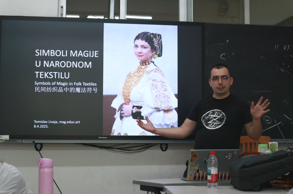 4月9日,工作坊以“民间纺织品中的魔法符号”为主题,介绍了克罗地亚传统工艺品中常见的符号和构图方式。利瓦亚先生指出,这些图案不仅具有装饰功能,更蕴含着丰富的文化寓意,许多图案源于自然崇拜的传统观念,广泛见于纺织、木雕及蜡染作品中。互动环节中,利瓦亚先生还展示了传统民间乐器——风笛(gajde)、六孔笛(diplice)和鲁特琴(tamburica)的演奏技巧,并指导学生尝试吹奏,让师生亲身体验克罗地亚传统乐器与音乐创作。