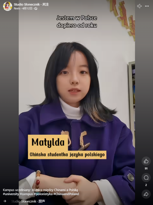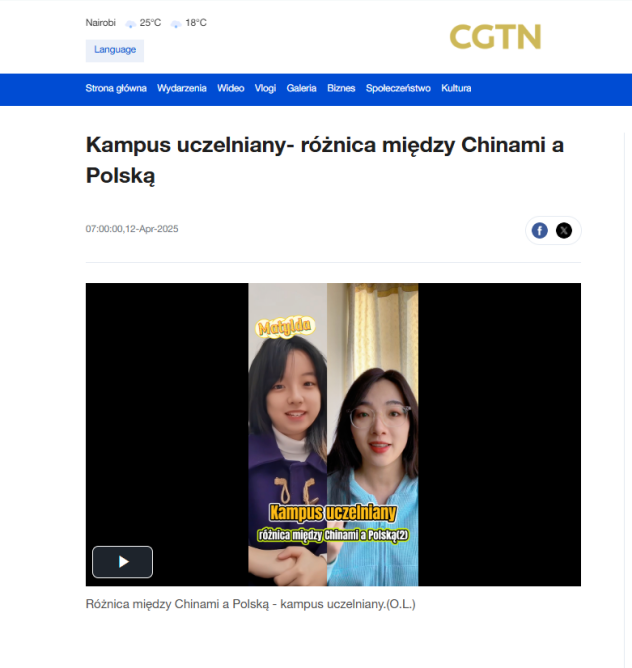 本网讯 4月12日,我院波兰语系本科四年级学生李铭琪受邀参与中国国际电视台(CGTN)波兰语频道短片《中波大学校园文化差异》(波语标题:Kampus uczelniany - różnica między Chinami a Polską)拍摄。她以在波兰亚当·密茨凯维奇大学的交换经历为切入点,向国际观众讲述跨越亚欧大陆的青春共鸣。