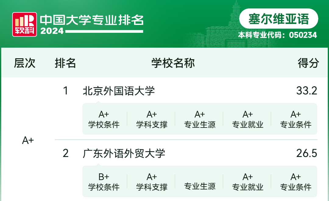 本网讯 6月18日,高等教育专业评价机构软科正式发布“2025软科中国大学专业排名”,我院6个专业名列前茅,其中,波兰语专业获得最高等级A+,排名全国第二;塞尔维亚语专业获得等级A+,排名全国第二。学院在欧洲非通用语教学领域具有深厚积淀与鲜明特色,是华南地区欧洲非通用语人才培养的核心基地。