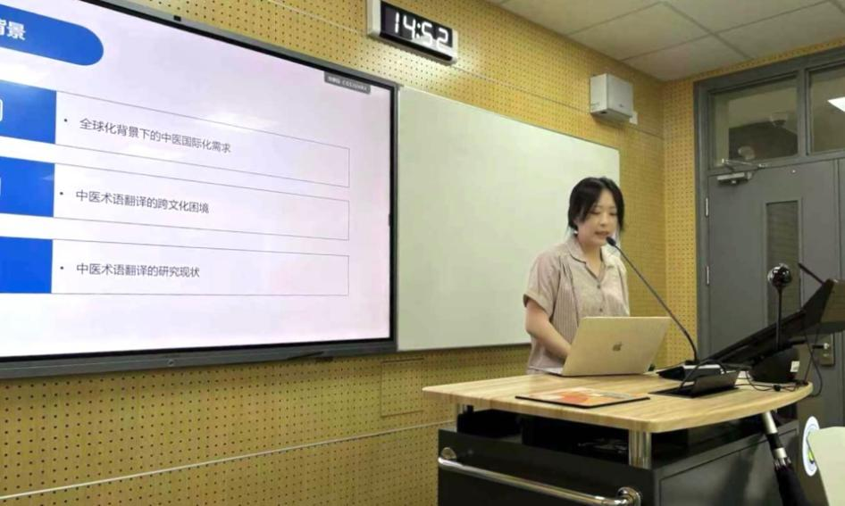 在“欧洲语言教学与研究”分论坛上,蔡洪召围绕《跨文化传播视角下中医诊疗术语捷译策略研究》展开探讨,从跨文化传播的视角出发,分析了当前翻译中存在的跨文化困境,并结合中医诊疗术语特点和实例,提出了多种翻译策略,强调中医术语翻译需突破字面对等,注重语境与文化背景因素,在传播与保留文化意象间找到平衡,以提升中医跨文化传播的效果。