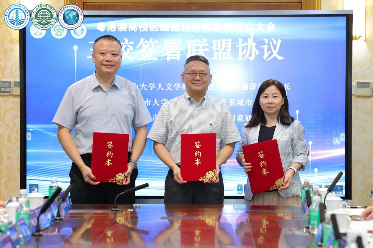 中山大学人文学部副主任、国际翻译学院院长常晨光教授,香港城市大学公共与国际事务系城市专业主任王珺教授,澳门城市大学副校长叶桂平教授分别代表三所联盟发起单位签署协议。