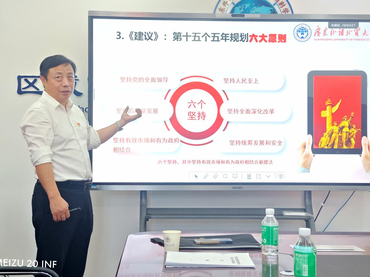 本网讯 11月6日下午,由区域国别学院(国际关系研究院)党委举办的深入学习贯彻党的二十届四中全会精神专题讲座在白云山校区举行。本次讲座以“挺立中国式现代化的精神脊梁——深入学习贯彻党的二十届四中全会精神”为主题,马克思主义学院院长毛国民教授受邀主讲。讲座由学院党委书记袁薇佳主持,全体教职工参加学习。