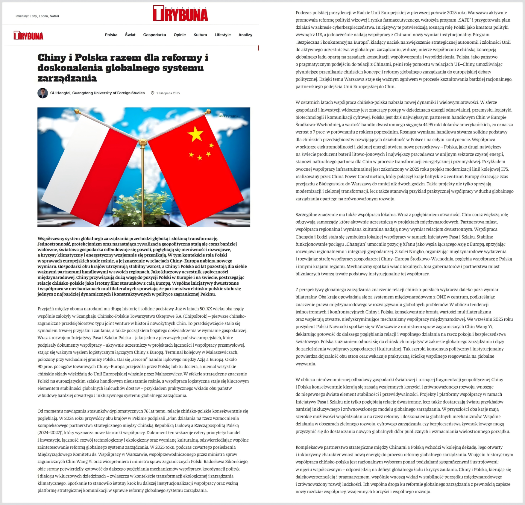 本网讯 11月7日,我院外交学系教师顾虹飞在波兰《论坛报》发表署名文章《中波携手为推动改革完善全球治理体系做出贡献》,深入阐释在中波全面战略伙伴关系即将步入下一个十年的历史节点,两国关系所展现的开放与包容特质,正为推动构建更加公正合理的全球治理体系注入新的活力。