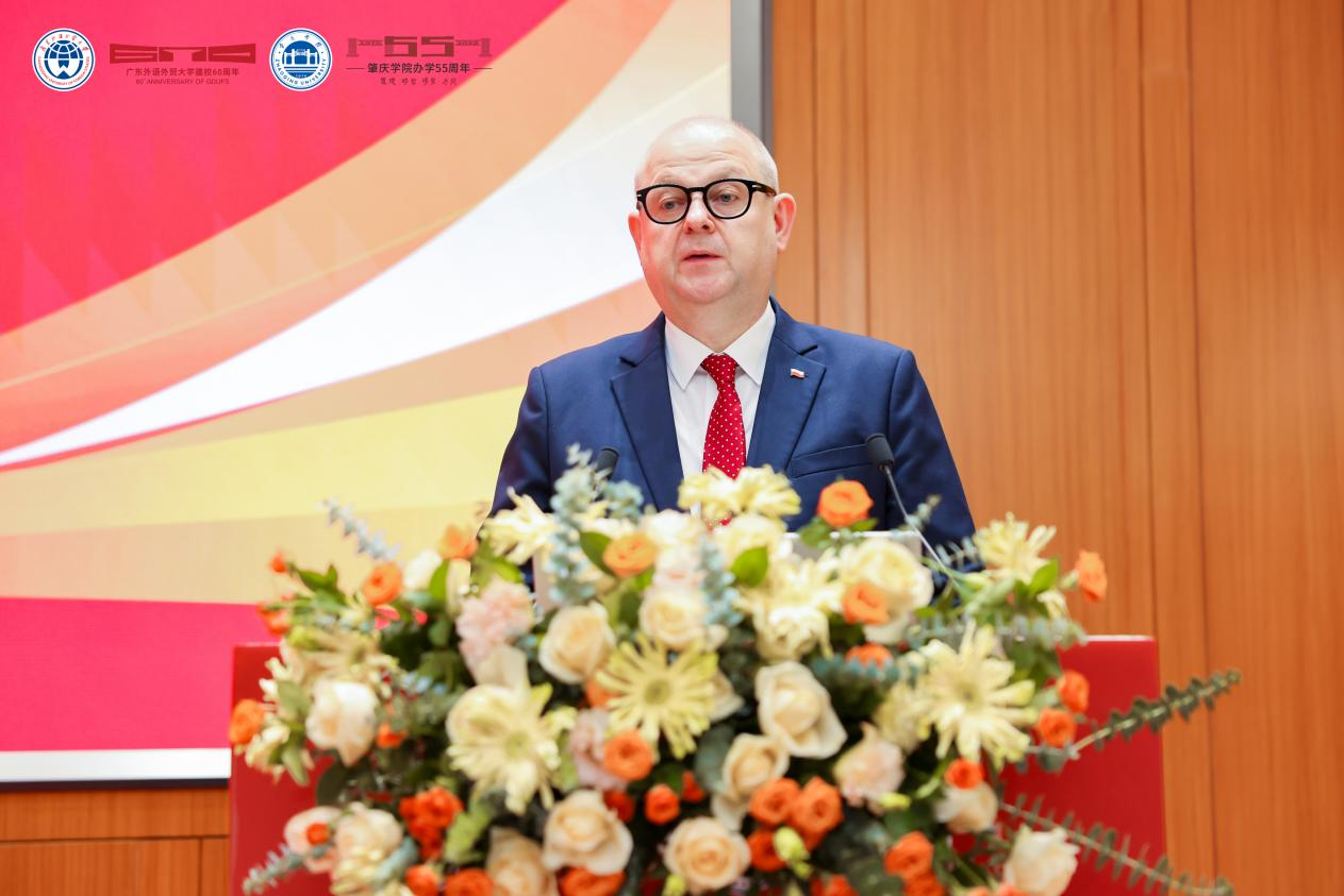 闫相斌校长在致辞中系统阐释区域国别学的学科意义,回顾了学校在学科建设、国际交流与人才培养方面的努力与成果;波兰共和国驻广州总领事彼得·诺沃特尼亚克先生高度评价中波合作,指出波兰作为中东欧重要国家,在历史、文化与教育领域与中国保持长期深入交流,并展望了中波及中国与中东欧国家学术合作的广阔未来;中共广东省委外事工作委员会办公室副主任李宏志结合地方外事实践,强调中东欧研究与国际合作要持续深化。