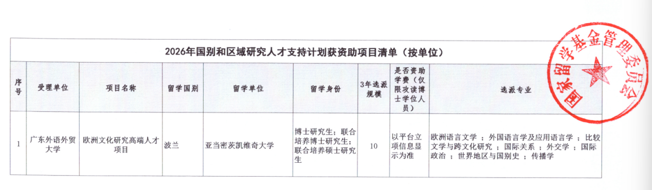 本网讯在学校的整体统筹及研究生院的指导下,区域国别学院(国际关系研究院)申报的“欧洲文化研究高端人才项目”再次成功立项国家留学基金管理委员会“国别和区域研究人才支持计划项目”(建设周期2026-2028年)并获专项资助。该项目第一期(建设周期2023-2025年)已高质量顺利完成,项目第二期再获立项,是对项目第一期建设效果及广外在服务国家战略、深化区域国别学研究与人才培养方面成果的肯定。