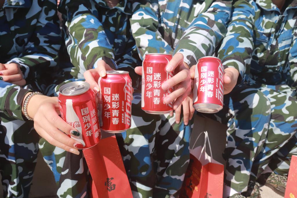 慰问环节,印有“国别少年,迷彩青春”字样的定制可乐引人注目,简洁有力的标语印刻着青春的热血与担当,为艰苦的军训时光注入了清甜的慰藉与温暖的力量。