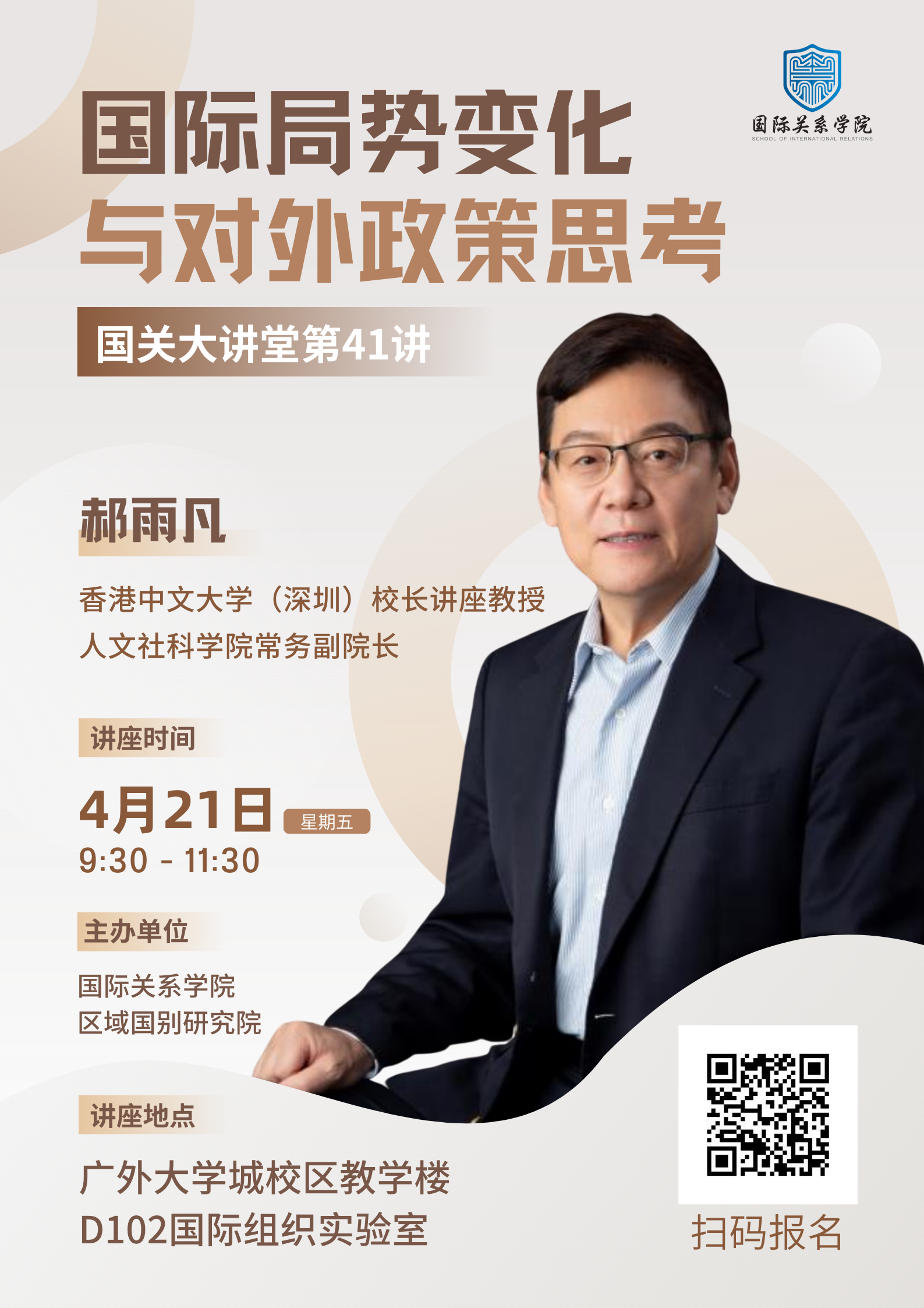 郝雨凡教授,香港中文大学(深圳)校长、讲座教授、人文社科学院常务副院长、全球研究项目主任。郝教授先后于1984年和1989年获得美国约翰霍普金斯大学高级国际问题研究院硕士和博士,曾任哈佛大学国际问题中心麦克亚瑟研究员,美国科盖特大学(Colgate University)政治科学教授及亚洲研究何鸿毅讲座教授。