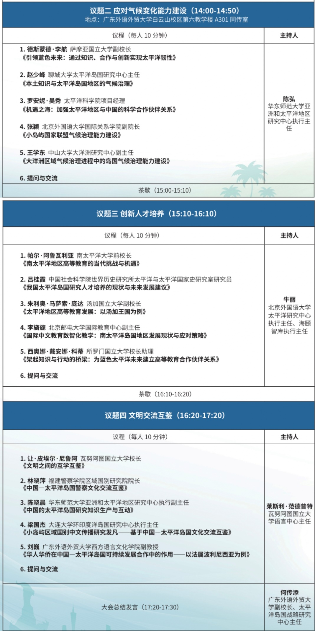 此次论坛聚焦“蓝色产业创新协同”“应对气候变化能力建设”“创新人才培养”“文明交流互鉴”四大议题展开交流研讨,以思想的碰撞点燃合作火花,为推动中国与太平洋岛国可持续发展合作建言献策,为深化中国与太平洋岛国友谊献上祝福。