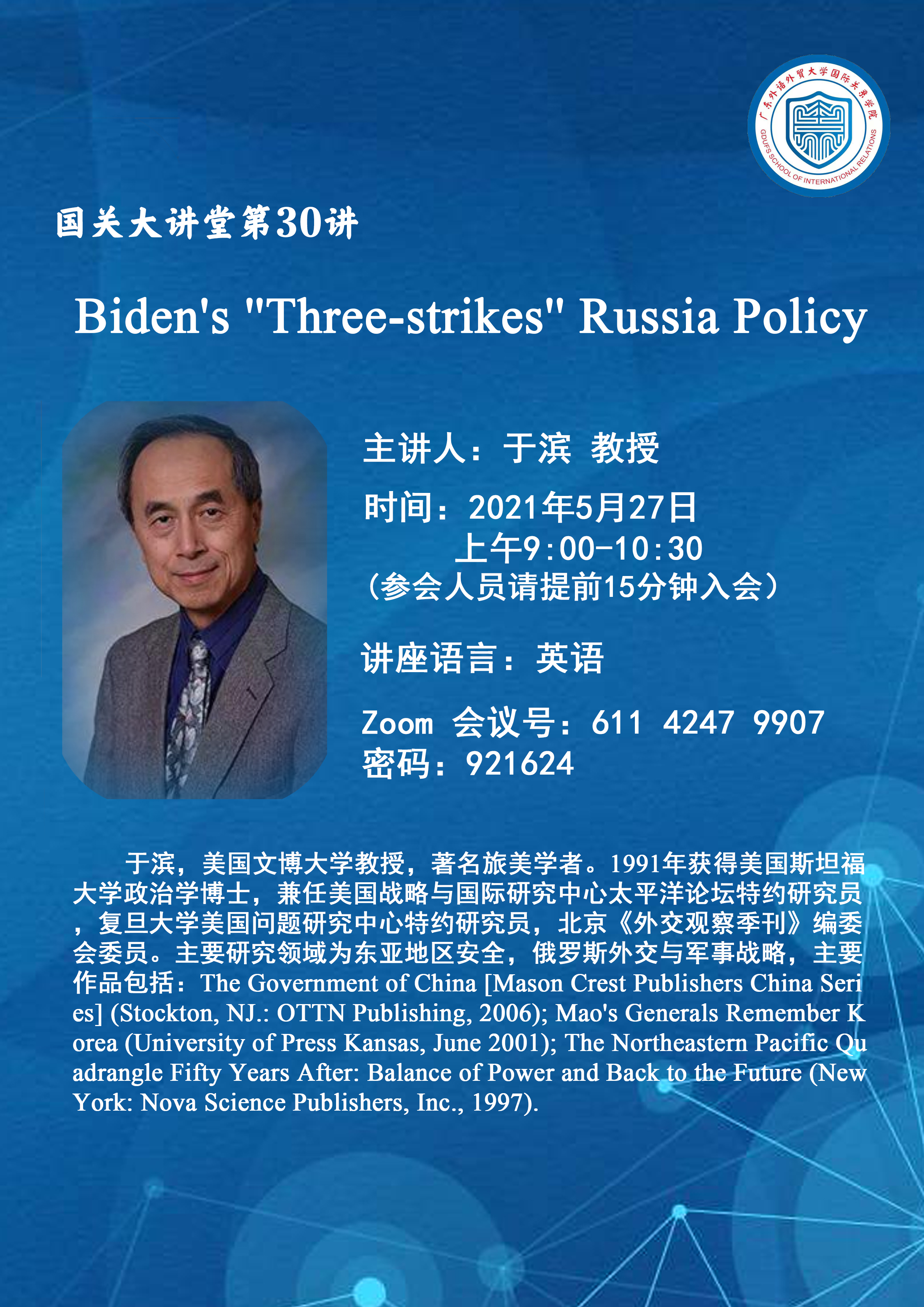 本网讯 2021年5月27日上午,广东外语外贸大学国际关系学院国关大讲堂第30讲顺利举行。 著名旅美学者、美国文博大学政治系教授于滨应邀于线上作题为“Biden’s ‘Three-strikes’ Russia Policy”的学术讲座。本次讲座由国际关系学院副院长吴艳主持,学院院长周方银教授作为嘉宾参与讲座。